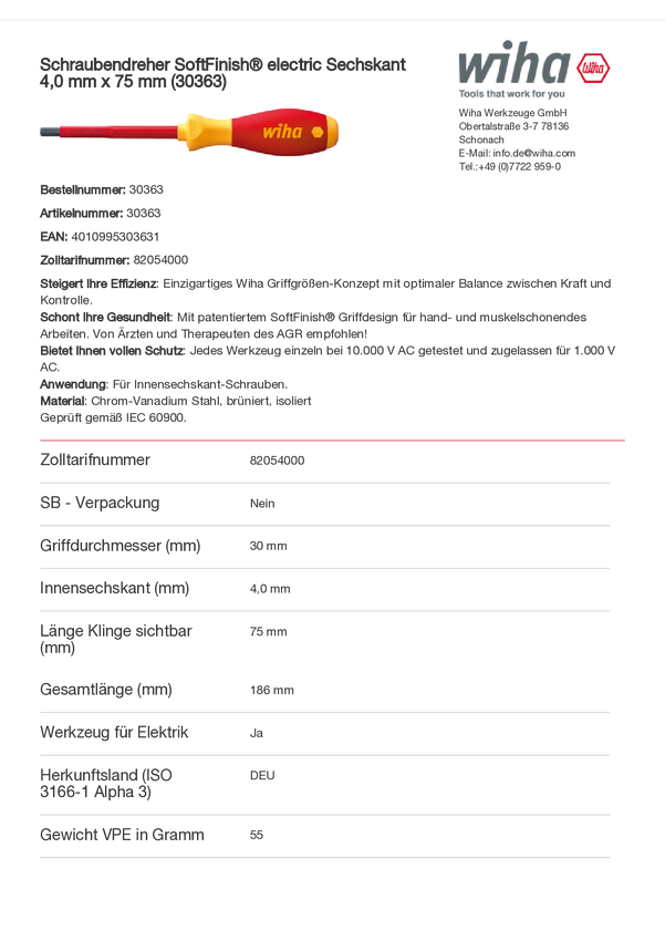 30363 Wkrętak imbusowy Wiha 323N SF 4,0x75 30363 4 mm