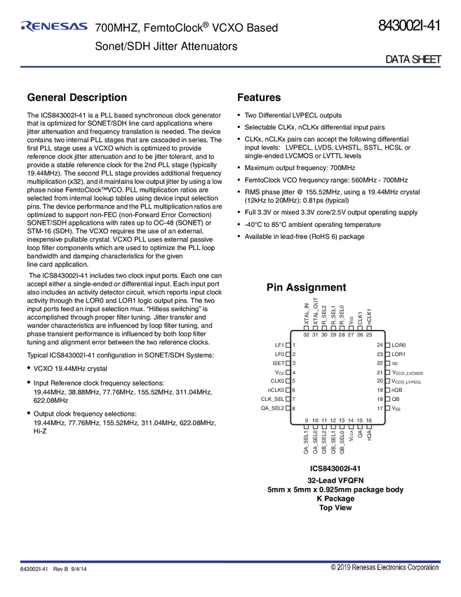 843002AKI-41LF 700MHz, FemtoClock VCXO Based SONET/SDH Jitter Attenuator