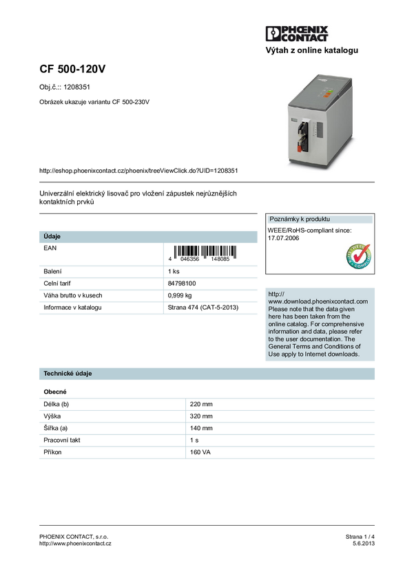 1208351 Phoenix Contact CF 500-120V 1208351 Zaciskarka elektryczna końcówki kablowe...
