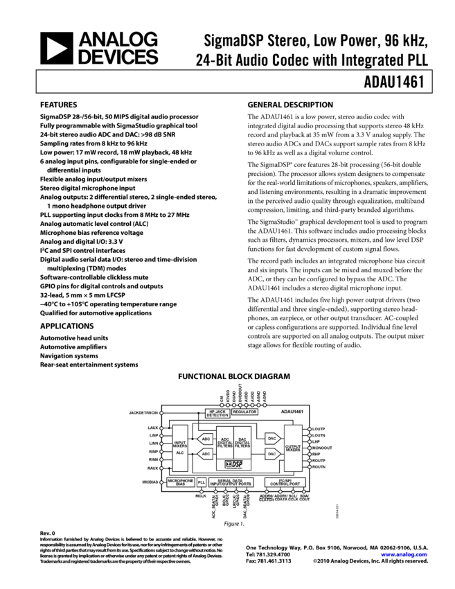 ADAU1461: SigmaDSP Stereo, Automotive Low Power, 96 kHz, 24-Bit Audio Codec with Integrated PLL