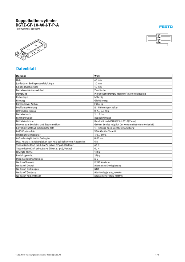 8103500 FESTO Siłownik z podwójnym tłokiem 8103500 DGTZ-GF-10-40-J-T-P-A Materiał o...
