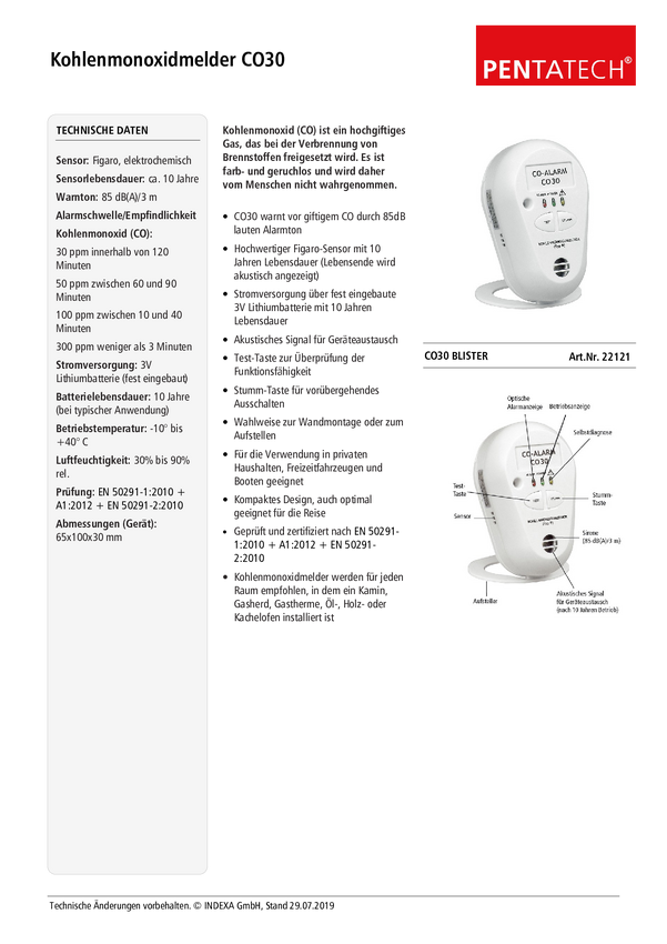 PENTATECH CO30 Czujnik czadu zaw. baterię na 10 lat pracy bateryjne Wykrywanie Tlenek węgla