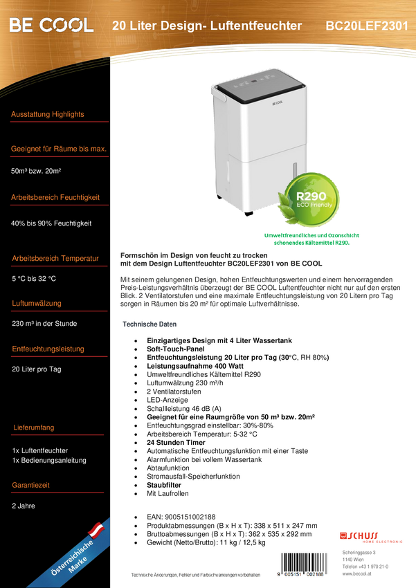 BC20LEF2301 Be Cool BC20LEF2301 Osuszacz powietrza 20 m² 400 W 20 l/dzień biały, sz...