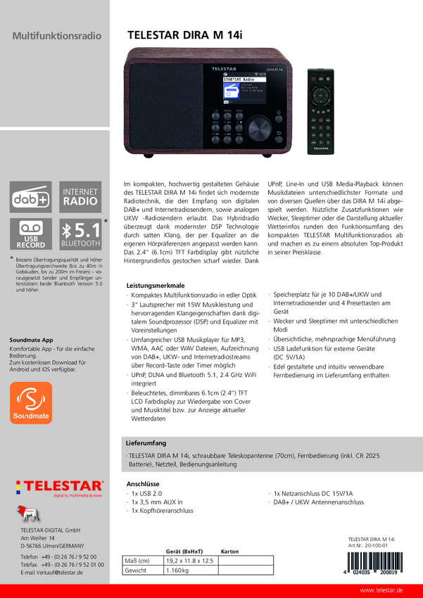20-100-01 Telestar DIRA M 14i Radio internetowe Internet, DAB+, fale metrowe (VHF) AU...