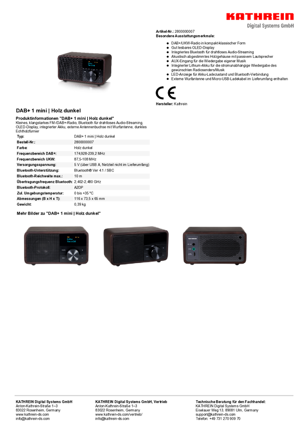 2800000007 Radio Kathrein DAB+ 1 mini DAB+, fale metrowe (VHF) drewno (ciemny)