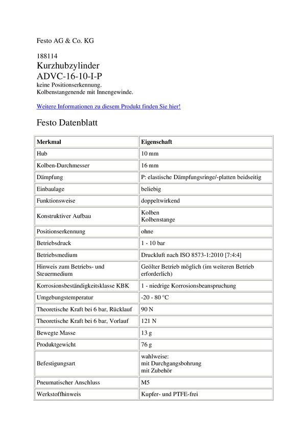 Siłownik z krótkim skokiem FESTO ADVC-16-10-I-P 188114, Długość skoku: 10 mm