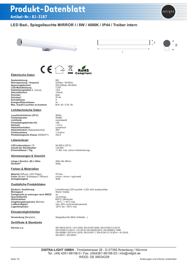 81-3187 Lampa ścienna, łazienkowa, LED mlight Mirror I 81-3187 8 W