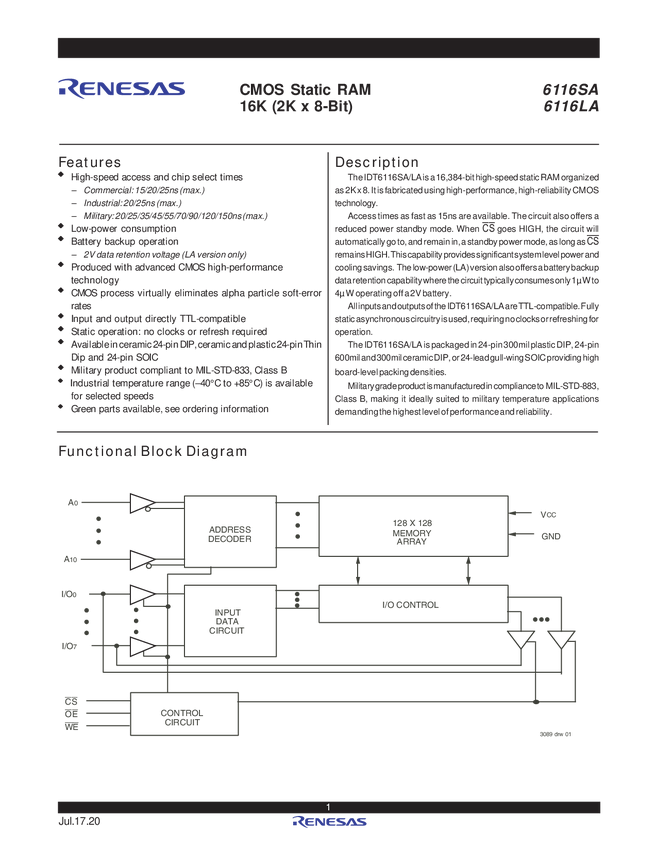 6116SA25SOG 5.0V 2K x 8 Asynchronous Static RAM