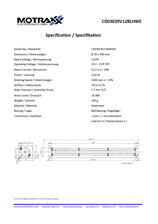 X-Fan CD03029V12BLHWE Wentylator krzyżowy Silnik lewy 12 V/DC