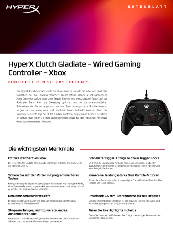 6L366AA HyperX Clutch Gladiate Xbox Gamepad PC, Xbox One, Xbox One S, Xbox Series S...