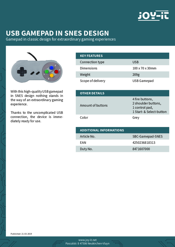 SBC-GAMEPAD-SNES Gamepad Raspberry Pi®, Uniwersalny Joy-it Gamepad SNES Design, USB, Rodzaj...