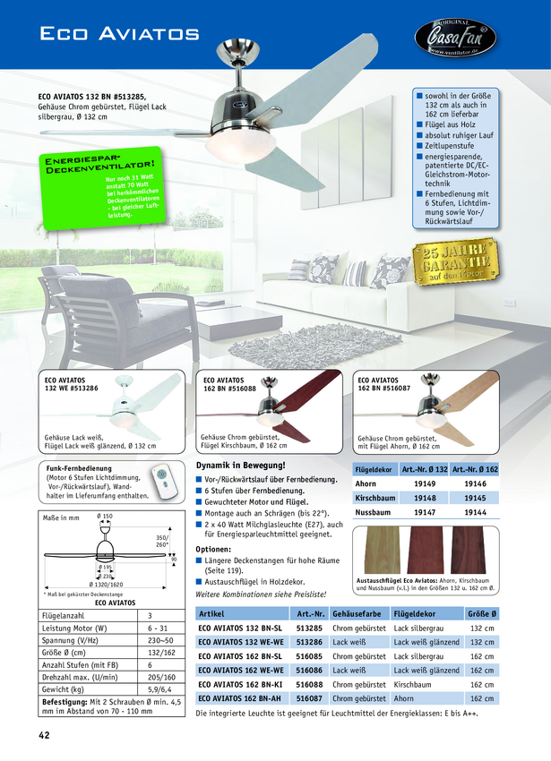 CasaFan Eco Aviatos 162 BN-SL Wentylator sufitowy 31 W (Ø x W) 162 cm x 365 mm chrom (szczotkowany) możliwość odwrócenia