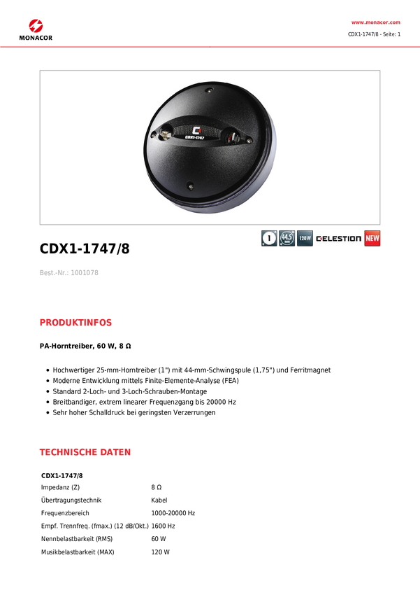 1001078 Celestion CDX1-1747/8 Sterownik tubowy PA Moc RMS=60 W 8 Ω