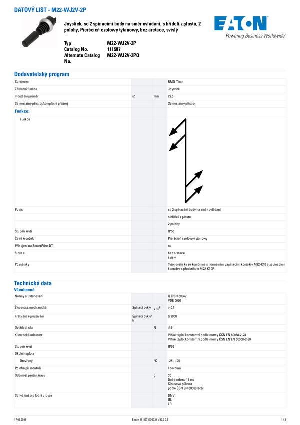 111507 Przełącznik typu joystick Eaton M22-WJ2V-2P 1 szt.