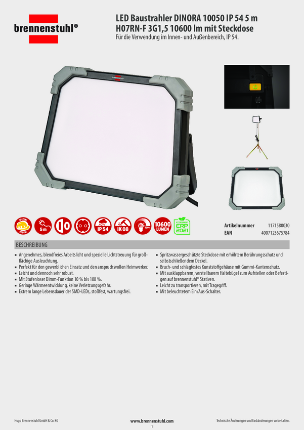 1171580030 Reflektor roboczy Brennenstuhl Dinora 10050 1171580030 EEK D (A - G) 85 W 1...