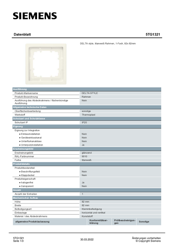 5TG1321 Siemens Osprzęt elektroinstalacyjny 1 x Ramka Delta biały 5TG1321 1 szt.