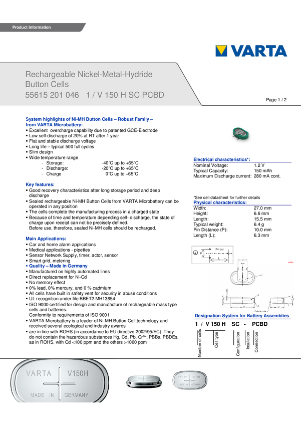 610150-010059 Akumulator guzikowy Varta V150H-SLF ++/- 150H NiMH 150 mAh 1.2 V 1 szt.