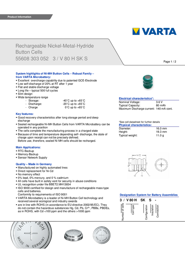 55608303052 Akumulator guzikowy Varta V3/80H 80H NiMH 80 mAh 3.6 V 1 szt.