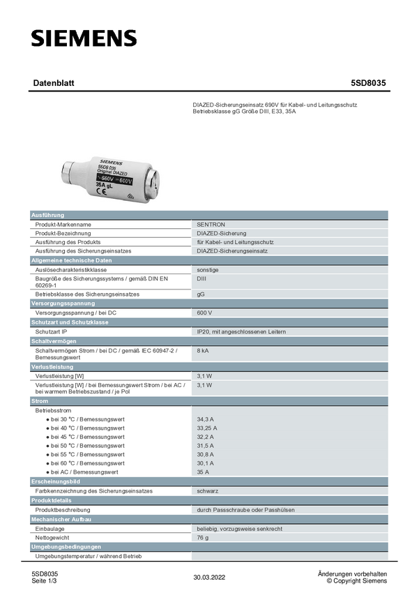 5SD8035 Bezpiecznik użytkowy Siemens 5SD8035 35 A 690 V/AC