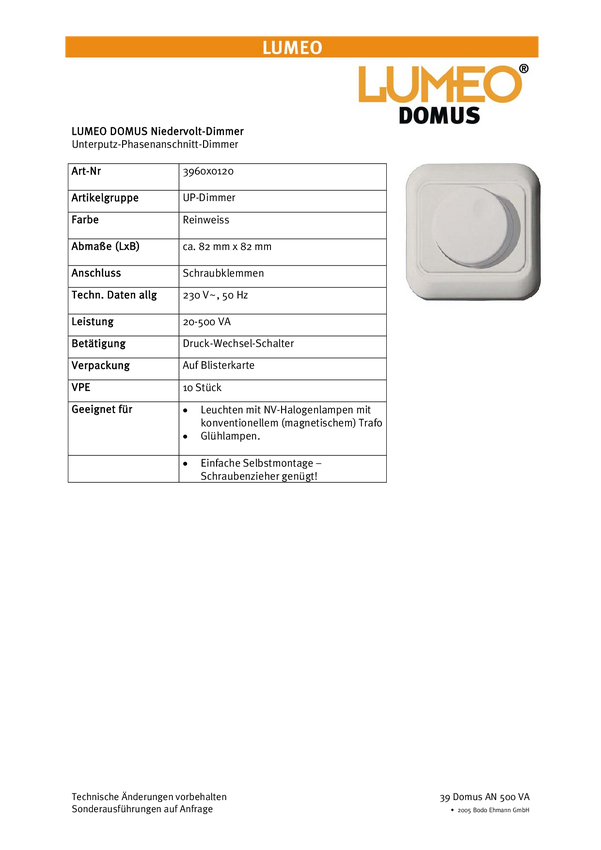 3960c0120 Ściemniacz naścienny do lampżarnikowych/halogenowych Ehmann, 20-500 W,...