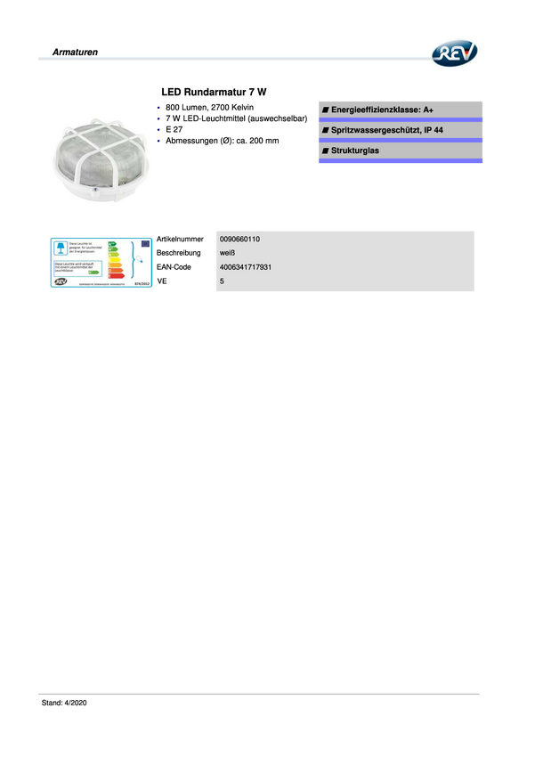 0090660110 REV Rundleuchte Kunstst.LED 7W ws Lampa z ochroną przed wilgocią LED E-27 7...