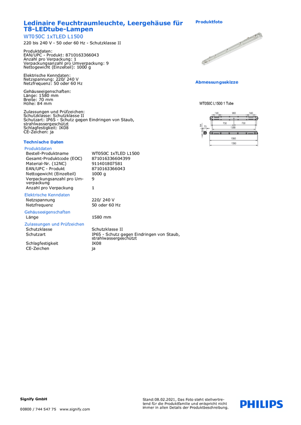 Lampa LED do wilgotnych pomieszczeń Philips LED Ledinaire WT050C 1xTLED L1500 36604399