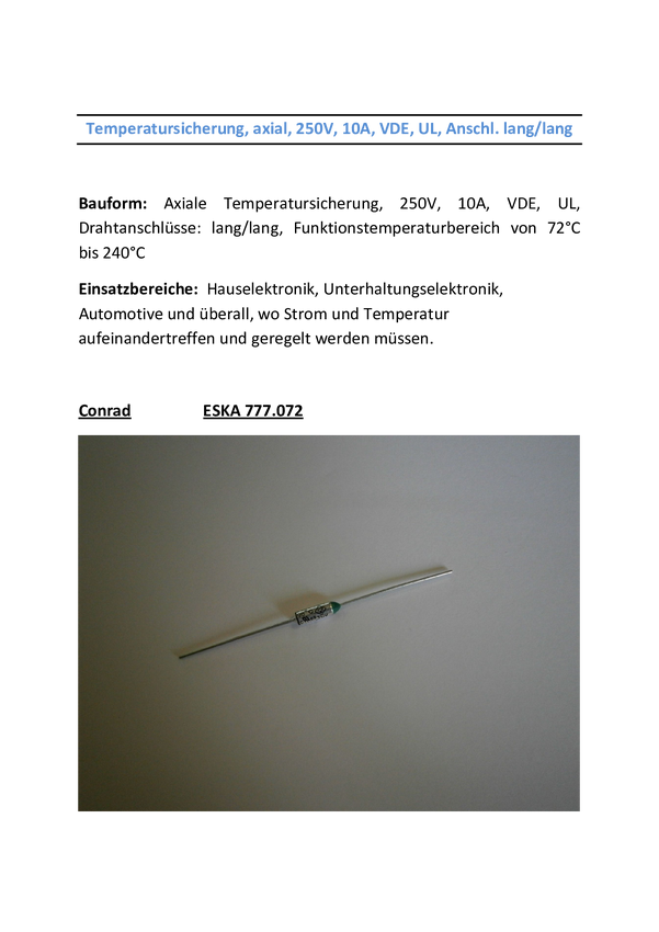 SW-102TL Bezpiecznik termiczny 72 °C 10 A 250 V ESKA SW-102TL 1 szt.
