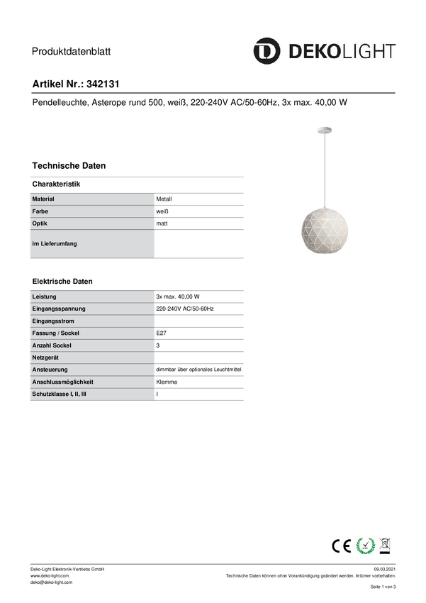 342131 Lampa sufitowa, podwieszana Deko Light Asterope rund 500 342131 E-27 40 W b...
