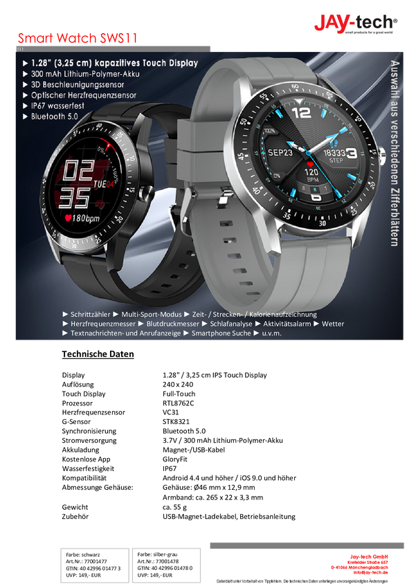 7700 1477 JayTech SWS 11 Smartwatch 46 mm Uni czarny