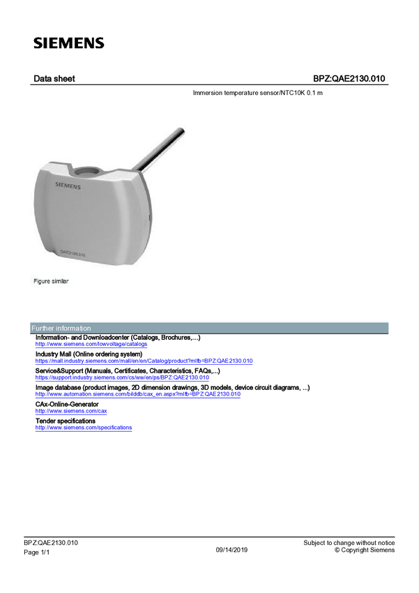 BPZ:QAE2130.010 Czujnik temperatury Siemens BPZ:QAE2130.010 BPZ:QAE2130.010