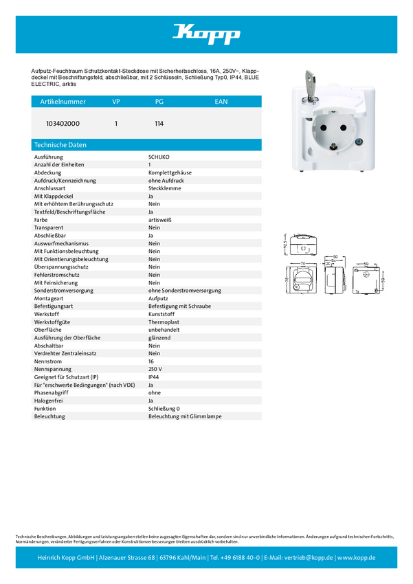 Kopp 103402000 1 szt. Osprzęt elektroinstalacyjny do pomieszczeń wilgotnych Komplet Gniazdo sieciowe, zamykane BlueElect