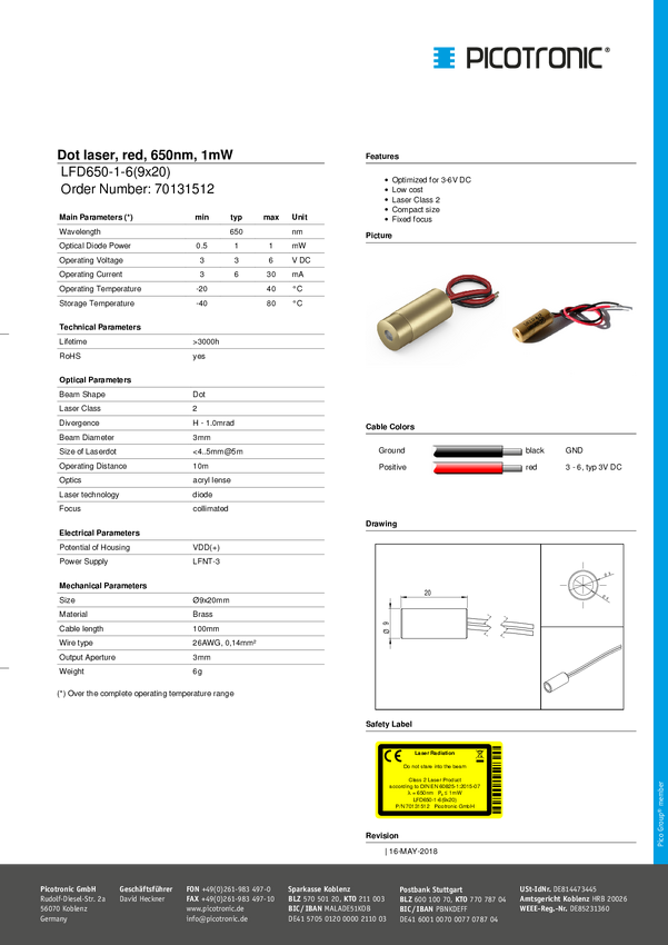 70131512 Laserfuchs Moduł laserowy punktowe czerwony 1 mW LFD650-1-12(9x20)