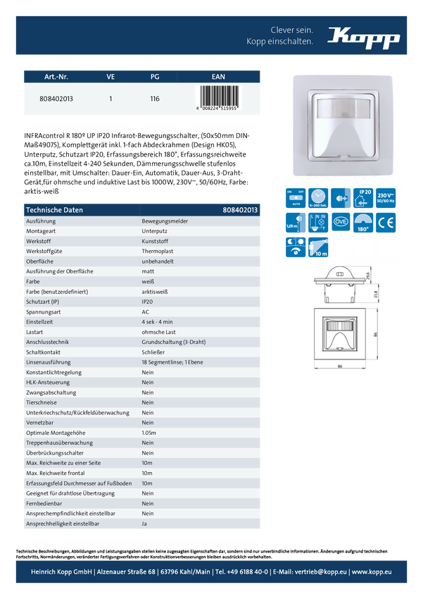 808402013 Czujnik ruchu Kopp 808402013 180 ° IP20 biały