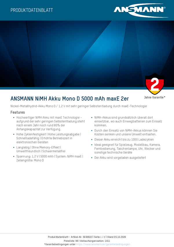 5030922 Akumulator D/R20 Ansmann maxE HR20 NiMH 5000 mAh 1.2 V 2 szt.