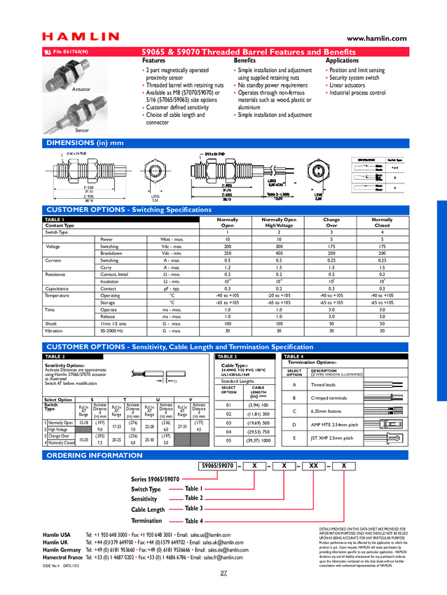 59070-1-T-02-A Hamlin 59070-1-T-02-A Kontaktron 1 NO 175 V/DC 0.25 A 5 W