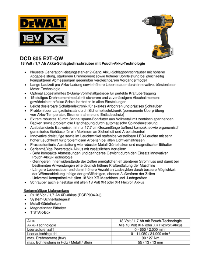 DCD805E2T-QW Wkrętarka udarowa akumulatorowa DEWALT DCD805E2T-QW 18 V 1700 mAh