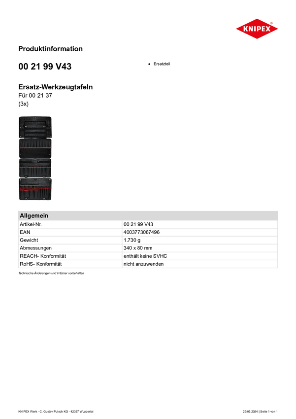 00 21 99 V43 Wymienne tablice narzędziowe Knipex Knipex-Werk 00 21 99 V43, 1 szt.
