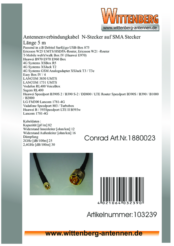 P-103239 Kabel antenowy Wittenberg Antennen P-103239 P-103239, Złącze N, Złącze SMA,...