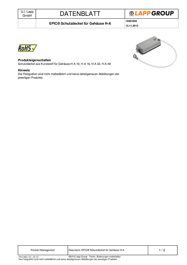 Pokrywa ochronna z klamrą, do obudów gniazda H-A 32 (pulpitowej, cokołowej, swobodnej) H-A 32 KDTF LAPP 10481600 Zawarto