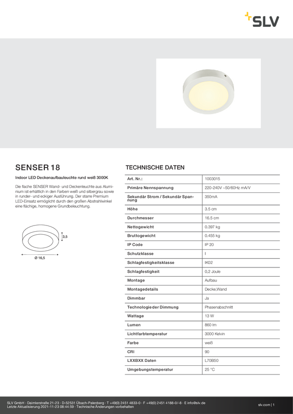 1003015 Lampa sufitowa LED SLV SENSER 18 1003015 12 W 880 lm biały