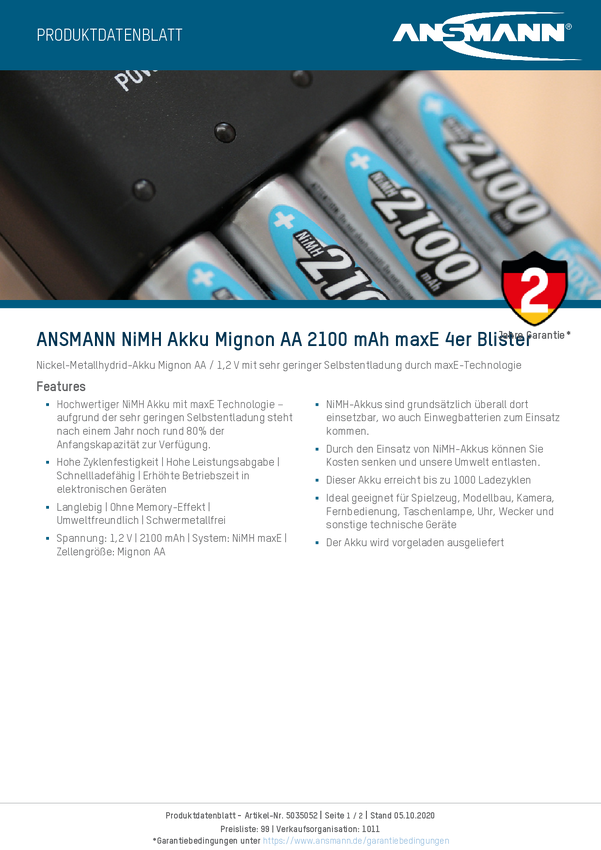 5035052 Akumulator AA/R06 Ansmann maxE HR06 5035052, NiMH, 2100 mAh, 1.2 V, 4 s...