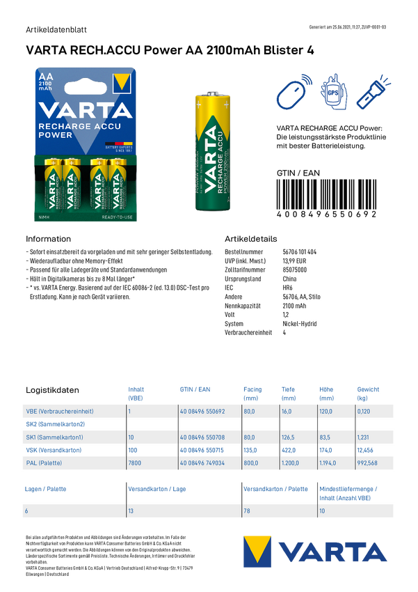 Akumulator AA/R06 Varta RECH.AC.Power AA2100mAh BLI4 56706101404, NiMH, 2100 mAh, 1.2 V, 4 szt.