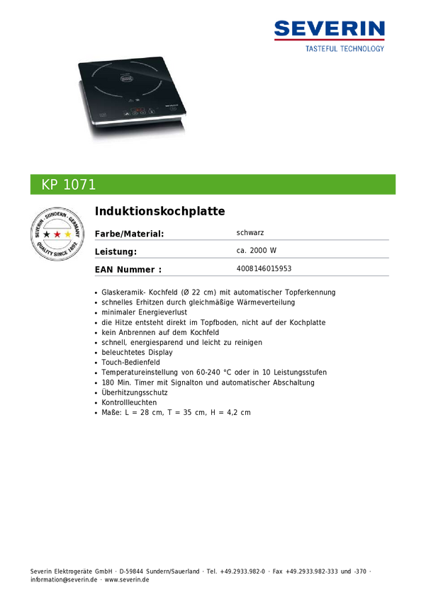 KP 1071 Płyta indukcyjna Severin KP 1071 z wykrywaniem patelni, z funkcją timera