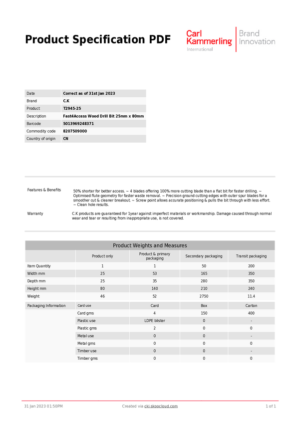 T2945-25 Wiertło spiralne do drewna C.K T2945-25 1 szt.