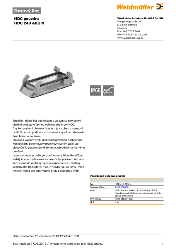 2488600000 Weidmüller HDC 24B ABU N 2488600000 Obudowa RockStar® Zawartość: 1 szt.