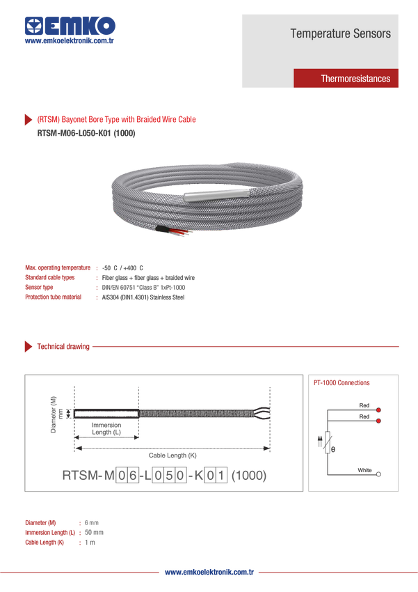Emko Czujnik temperatury RTSM-M06-L050-K01 (1000) Rodzaj czujnika Pt1000 Zakres pomiarowy temperatury-50 do +400 °C Szer