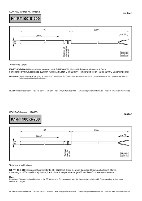K1-PT100-S-6x50-2M-2L Termometr oporowy Suran Enda K1-Pt100-S-200 od -50 do +200Ä''°C