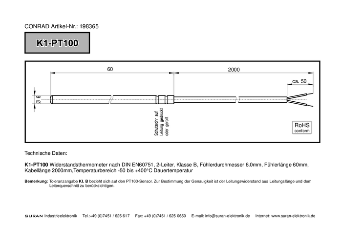 K1-PT100-6x60-2M Termometr oporowy Suran Enda K1-Pt100 od -50 do +400 Ä''°C