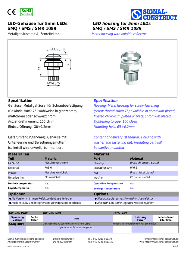 SMQ1089 Oprawka LED metal Odpowiedni do LED 5 mm mocowanie śrubowe Signal Construct...