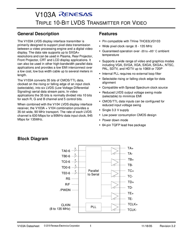 V103AYLF 10-bit LVDS Transmitter